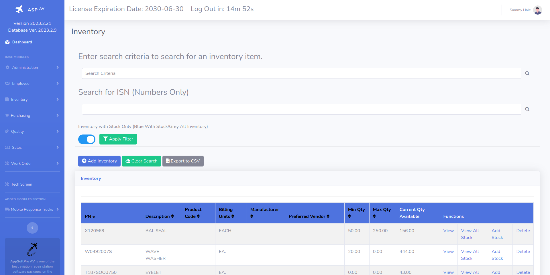 | Inventory | The inventory section allows the user to add part numbers to the system as well as add and view stock items. |