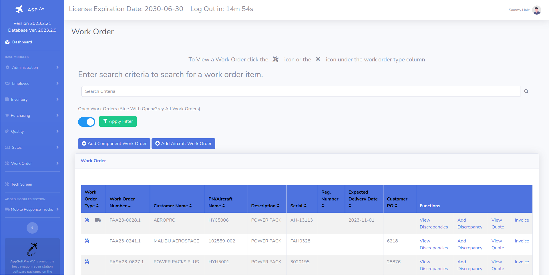 | Work Order | This section allows the user create, view, add discrepancies, create/view quotes and create and view invoices for a work order. |